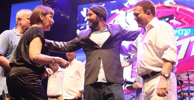 Минстр культуры Лимор Ливнат, победитель конкурса Эвен Малах, председатель жюри певец и актер Йорам Гаон