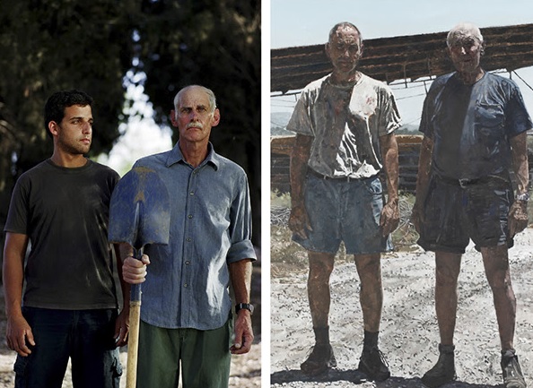 Открывает экспозицию пара работ, которые условно можно назвать «Отец и сын». На картине Эли Шамира изображен он сам со своим отцом. Это реалистическая работа с реальными и узнаваемыми персонажами. Соседствует с ней постановочный снимок Ади Неса, на котором мы видим двух мужчин – молодого и пожилого, условных отца и сына. К слову, все работы Неса постановочные, он подбирает локацию и «актеров» месяцами, долго продумывает мизансцену, выставляет свет, работает над выражением лиц и пластикой.