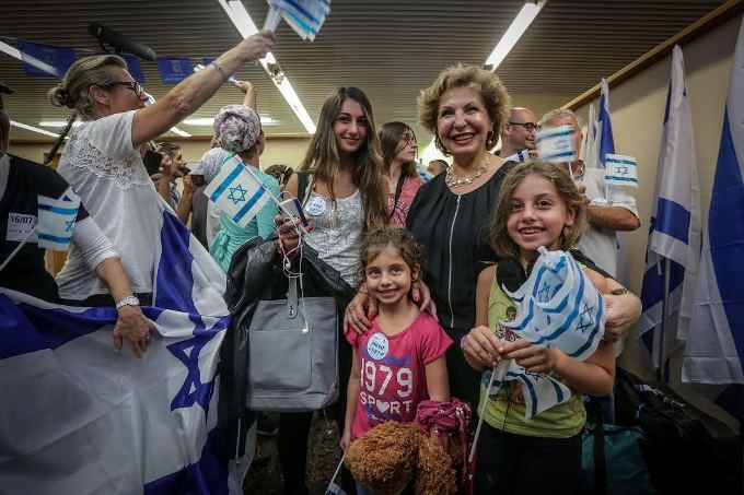 Министр репатриации и абсорбции Софа Ландвер с новыми гражданами страны