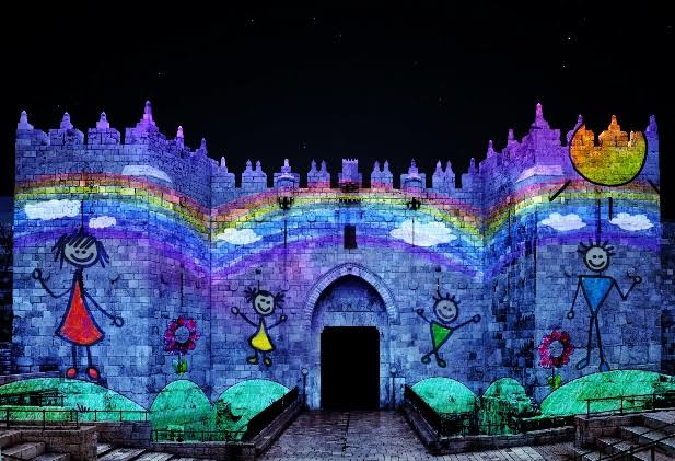 В эти дни удивительные существа поселились в узких улочках и переулках старого города: в сводчатых арках притаились медузы, на площадях выросли гигантские одуванчики, к стенам прильнули диковинные спирали. Кажется, будто все мы попали на какую-то таинственную планету. Яффские ворота украсили яркие цветы, а Шхемские ворота в эти дни переименовали в Детские, и на них появились проекции рисунков израильских детей.