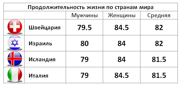 Итак, как вы себя чувствуете? Если верить данным ВОЗ, то превосходно. Средняя продолжительность жизни в Израиле, согласно данным ежегодного отчета Всемирной Организации Здравоохранения (ВОЗ), одна из самых высоких в Европе. Этот показатель определяется целым рядом критериев, в числе которых уровень жизни, хорошая экология, отсутствие вредных привычек, и т.д. С 1995 года средняя продолжительность жизни израильтян выросла на 5 лет и сегодня она равняется 82 годам, тогда как по странам Европы аналогичный показатель составляет 76 лет. Израильские женщины доживают в среднем до 84 лет, мужчины-израильтяне – до 80 лет.