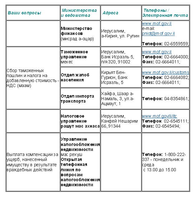 Министерство финансов (мисрад а-оцар) Всё об Израиле20 июля 2005 года Информация о деятельности некоторых организаций и учреждений в Израиле, куда чаще всего обращаются репатрианты для решения самых разнообразных вопросов.