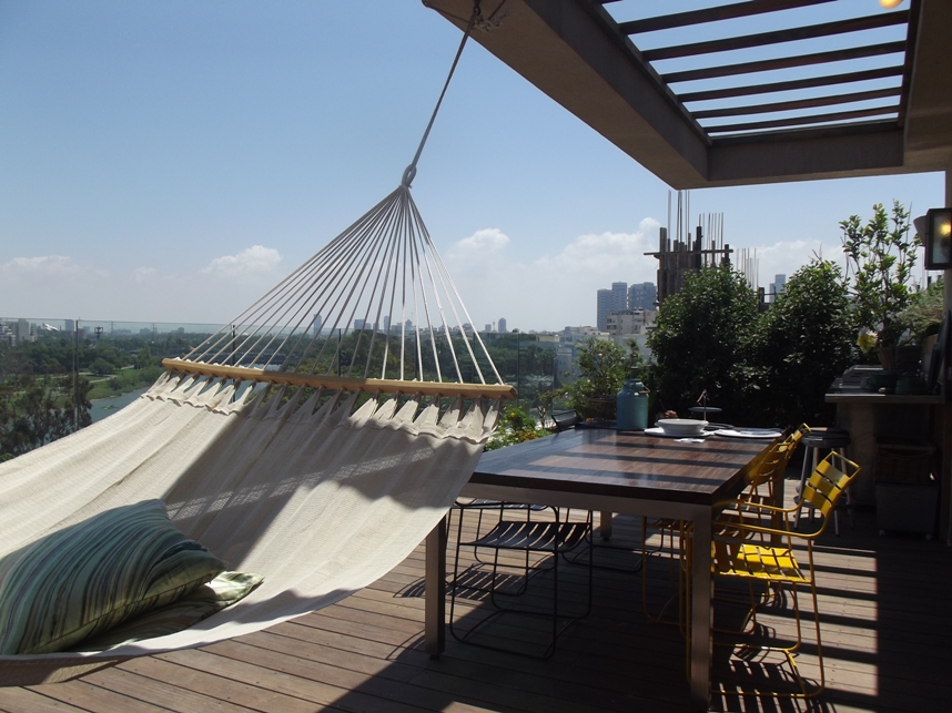 Первое, что обращает на себя внимание в этой квартире – огромный балкон со стеклянными ограждениями, откуда открывается чудесный вид на парк Ха-Яркон. Балкон оборудован зоной отдыха с диванами и гамаком, обеденным столом и летней кухней, и при этом здесь еще остается достаточно много места. Не сомневаемся, что именно это пространство пользуется самой большой любовью домочадцев во всей квартире.
